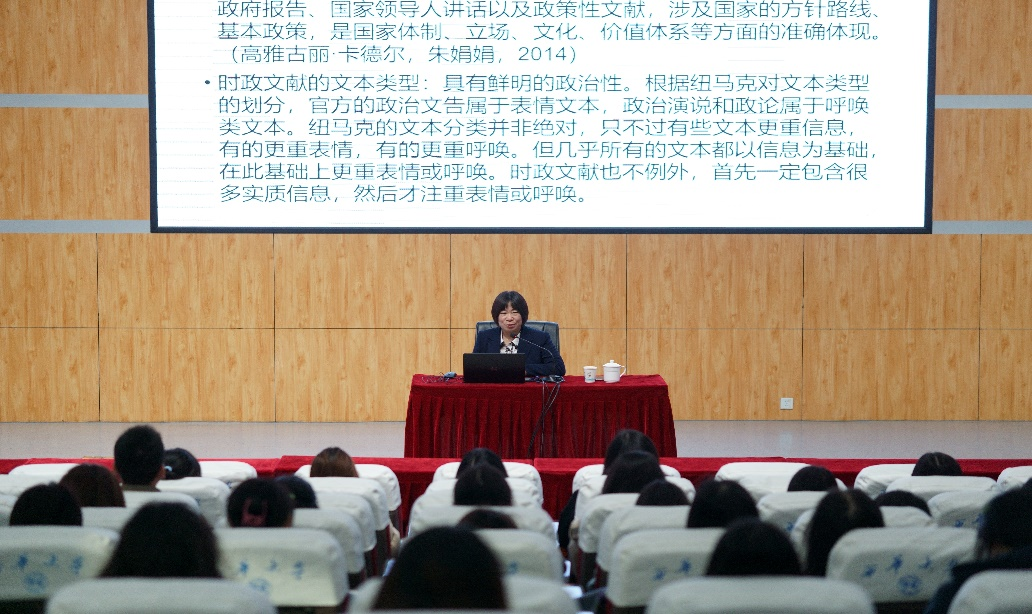 本次讲座,彭萍教授从时政翻译面临的时代新形势、时政文献语言特色及翻译原则入手,对时政文献翻译重要性、翻译在文化传播中的作用及翻译传播渠道等方面进行了深入阐释。