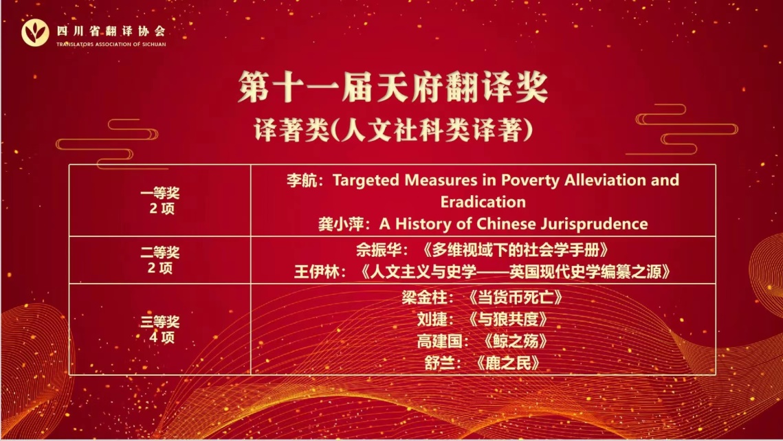 在本次年会上,新葡京官网龚小萍教授和于云飞博士的译著《A History of Chinese Jurisprudence》荣获第十一届“天府翻译奖”译著类(人文社科类译著)一等奖。“天府翻译奖”是目前四川省翻译学界规格最高的奖励,新葡京官网学者获此殊荣,体现了四川翻译学术共同体对新葡的京集团8814翻译实践能力的极大鼓励与高度认可。