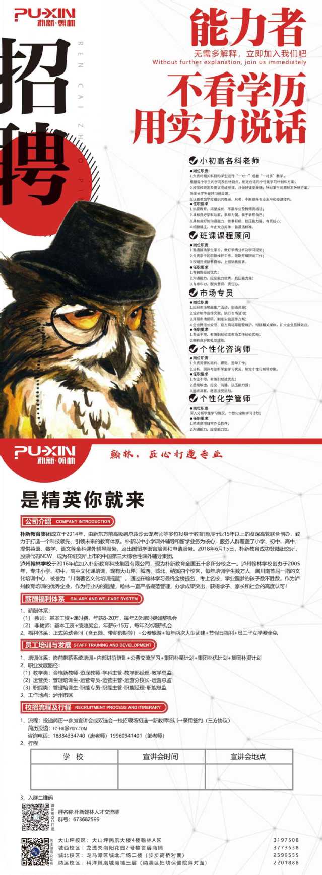 我们有小初高各科教师(年薪8-20万)、班课课程顾问、个性化咨询师、个性化学管师、市场专员等丰富的岗位等你就位! 更有百元红包大奖等你来拿,期待你们的到来!赶快行动吧。扫码入微信群或戳海报加QQ群,发送简历至zoutiantian@pxjy.com 或 lz-hr@pxjy.com