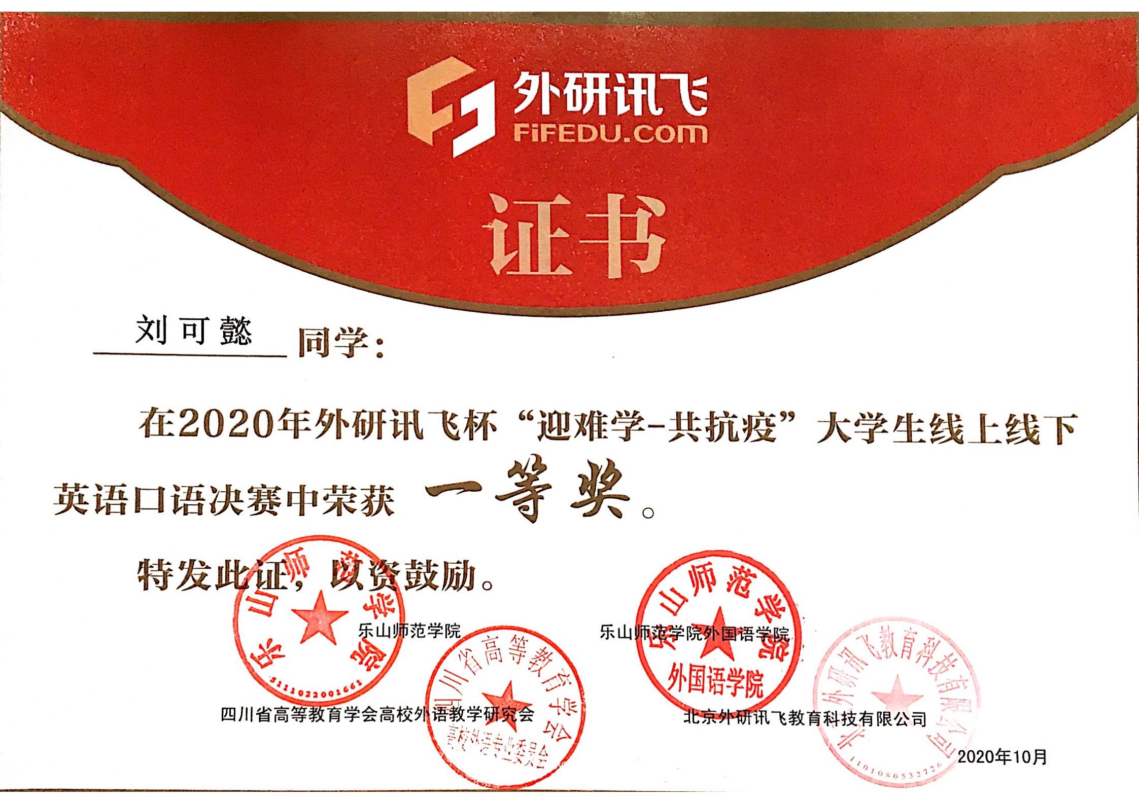 为贯彻落实习近平总书记关于疫情防控工作的重要指示精神以及教育部“停课不停学”的教学指导意见,由乐山师范学院主办、四川省高等教育学会高校外语教学研究会和北京外延讯飞教育科技有限公司协办的外研讯飞杯“迎难学-共抗疫”大学生线上线下英语口语大赛线上邀请赛圆满落幕。全省有西南交通大学、西南财经大学、西南石油大学、四川师范大学、西华师范大学、绵阳师范学院等共计38所院校积极参赛,参赛人数13849人。新葡京官网新葡的京集团88142019级翻译专业刘可懿同学在本次大赛中凭借出色的表现,获得本次比赛一等奖。