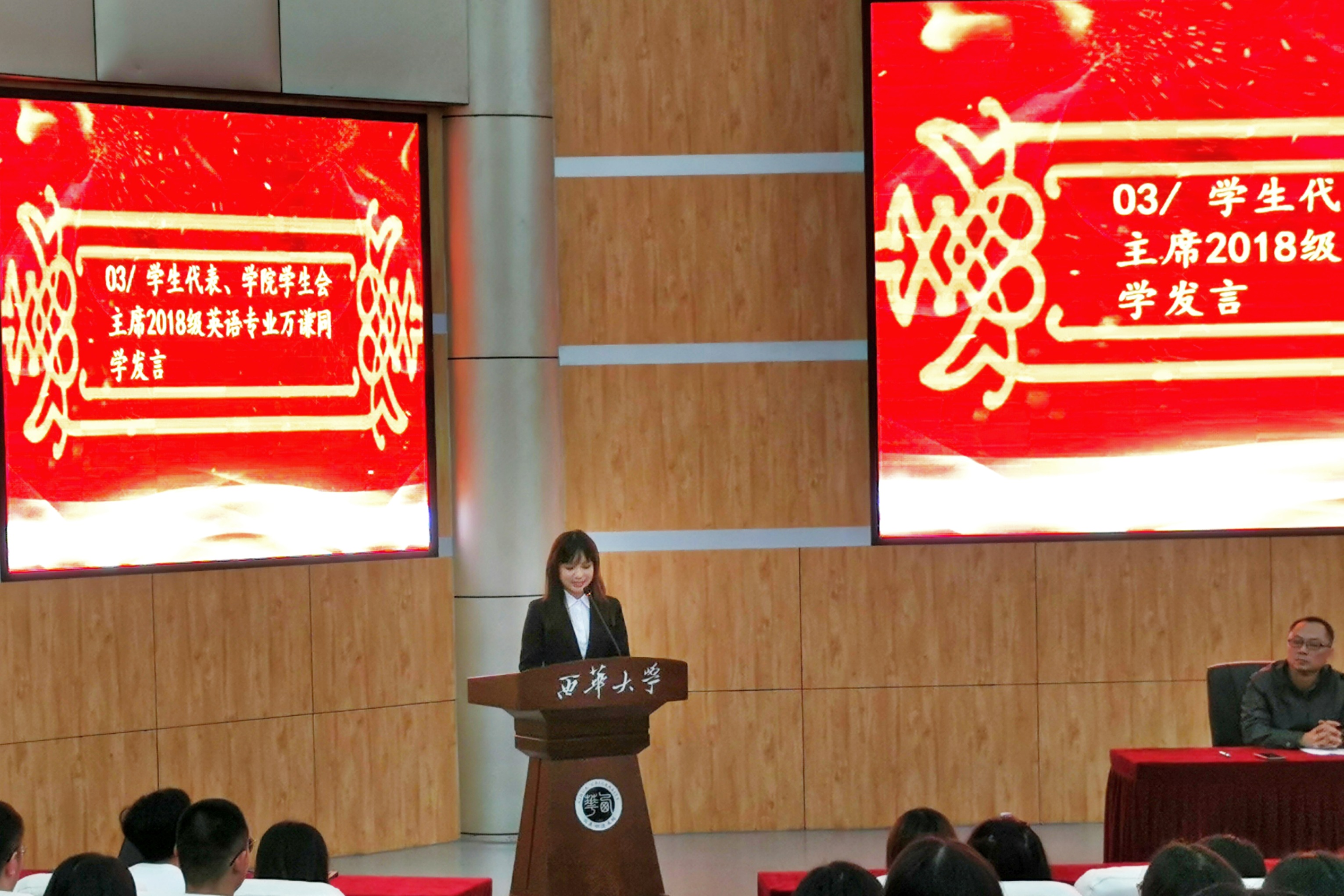 2018级英语专业万谦同学作为在校生代表发言,她向学弟学妹号召开始新的工作、学习和生活的同时,要细化人生规划,确保学有所成;要积极进取,勇于担当;要坚定信心,抓住机遇。