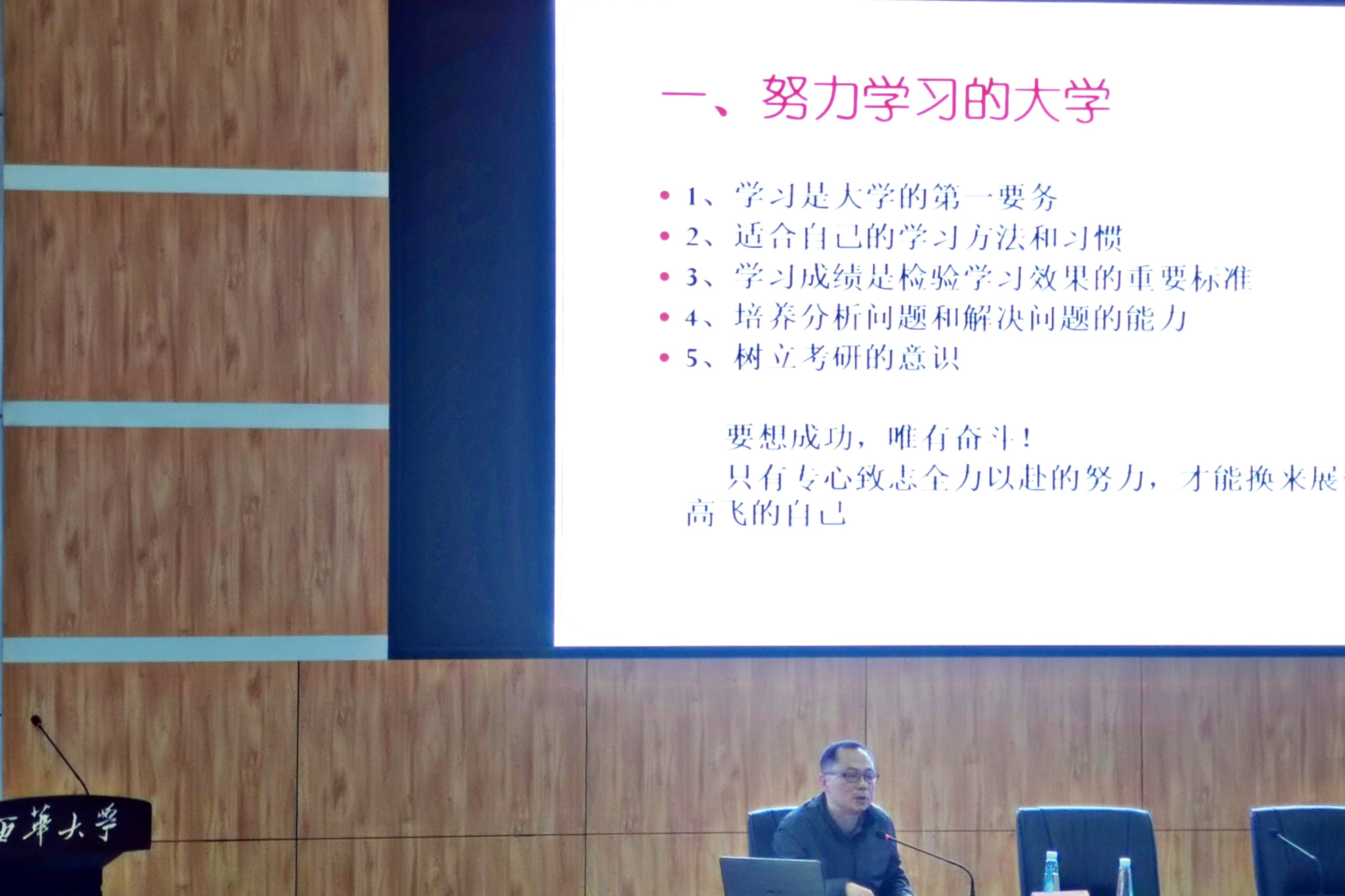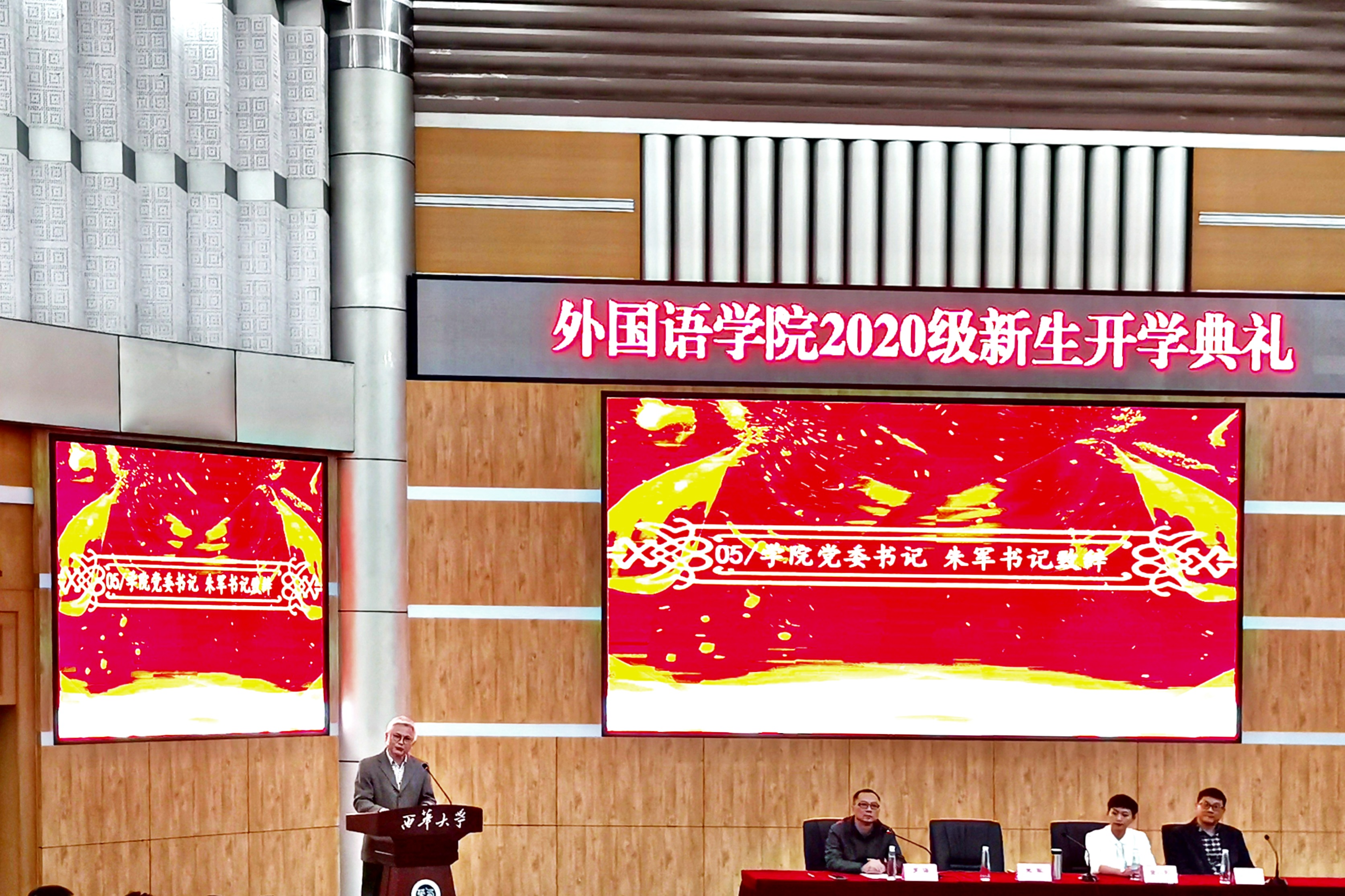在热烈的掌声中,学院党委书记朱军致辞。正值学校建校60周年,朱军书记代表学校向新同学表示热烈的欢迎。在同学们跨入新阶段之际,朱军书记提出三点嘱咐与同学们共勉。一是确立新目标,开启新征程,将个人梦想和时代的发展相结合,与历史同步伐,与时代共命运。二是取得新进步,做与时代同行的西华人。希望同学们顺应全球格局的变化与发展,在老师的引导下主动转变学习方式,积极探索新的学习莫式。三是获得新成长,做知行合一的西华人,脚踏实地完成学业的同时,积极投身社会实践,走出校园,了解国情。