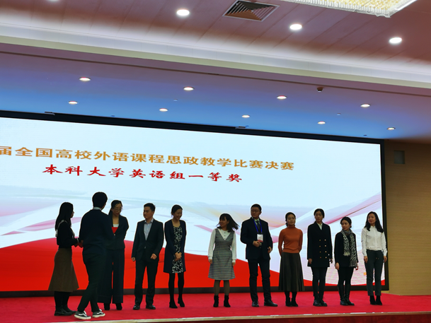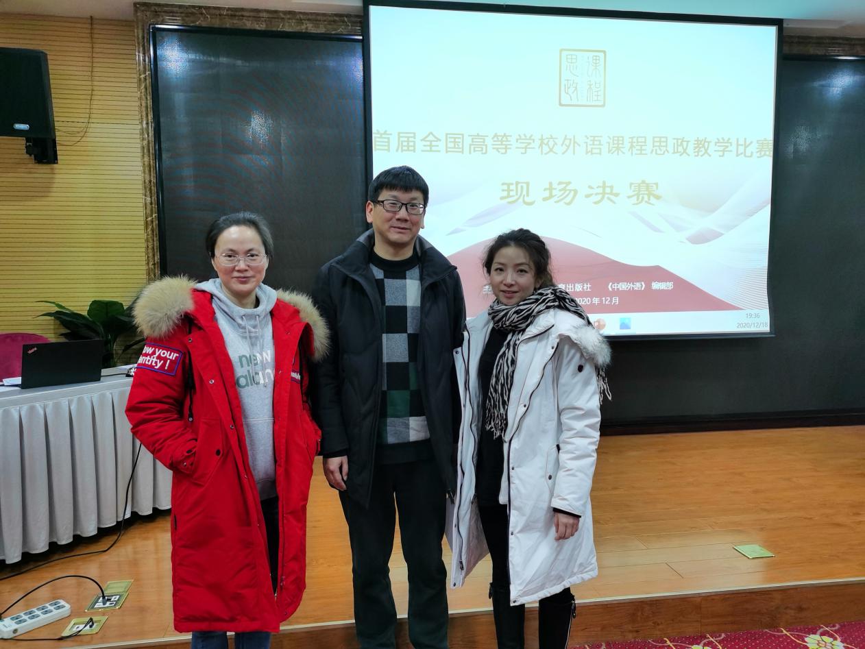 2020年12月18日-21日,首届全国高等学校外语课程思政教学比赛在北京落下帷幕,新葡京官网新葡的京集团8814教师李学芹、彭旭、王成珍组成的团队荣获全国一等奖。本次比赛共有来自全国29个省、直辖市、自治区771所高校参加。历时半年(2020年6月-12月),经过了4轮激烈的角逐,从全国初赛的1500个参赛选手中脱颖而出,3位老师过关斩将,并最终取得了全国一等奖,充分展示了新葡的京集团8814教师课程思政教学能力。