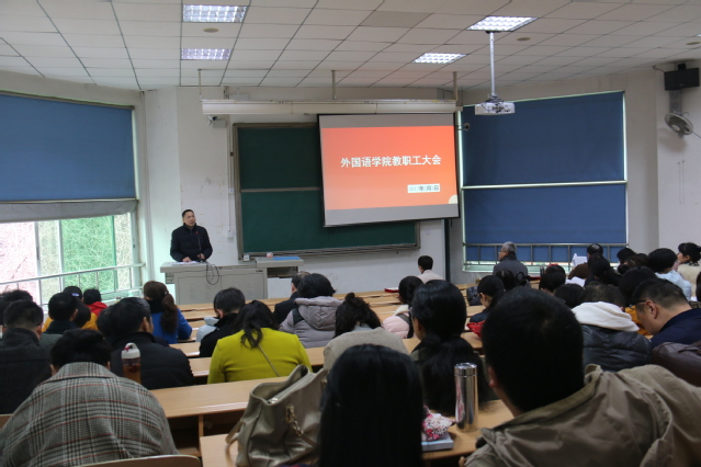 大会起始,陈达院长结合学校2017年度工作工作要点,部署安排今年学院的工作。他首先就2016年学院有关成绩进行了梳理,并就学院进人情况对新到新葡京官网报到的法语教师袁乙榛老师表示热烈欢迎,随后对于学院寒假重要工作进行了全院通报。