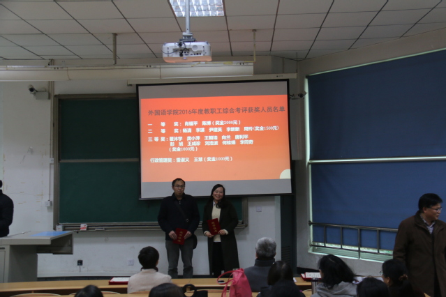 最后,学院党委副书记兼副院长宣读了学院2016年度综合考评获奖人员名单(见下图),并由学院领导为获奖老师颁奖。会上,学院党委副书记兼副院长曾国勇还就2016年学院招生情况与就业情况进行了通报,并号召全院师生关心学院发展,关注关心学生就业问题。