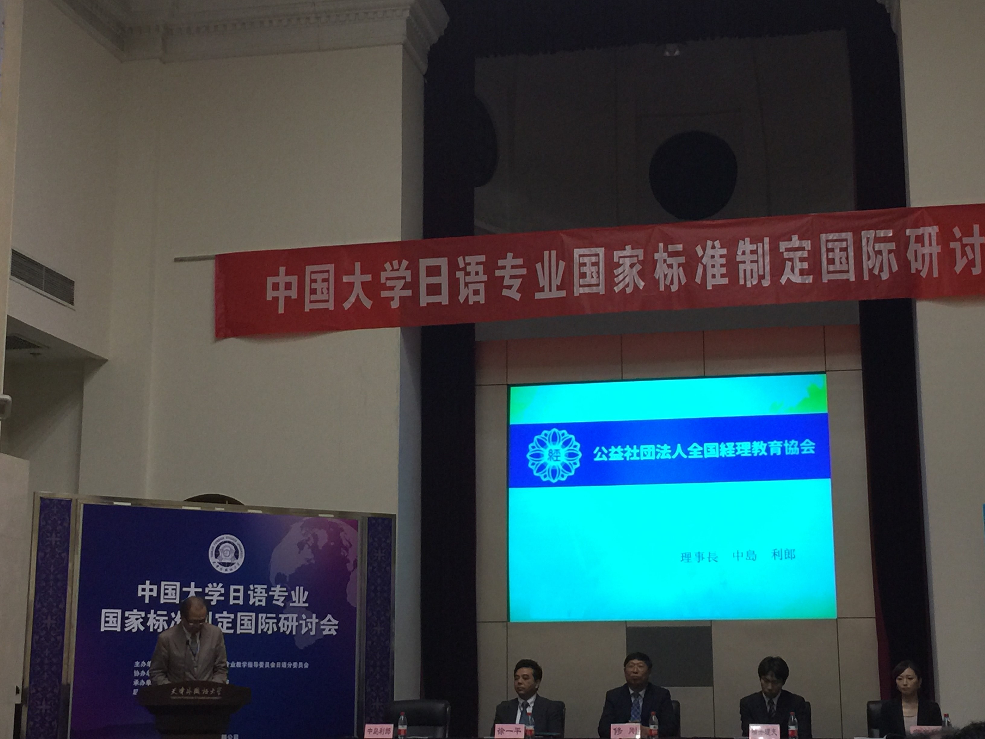 天津外国语大学日语学院院长朱鹏霄教授主持的开幕式。天津外国语大学校长修刚教授、日本驻华大使馆参赞横井理夫、日本国际交流基金北京日本文化中心主任助理守屋谅、公益社团法人全国经理教育协会理事长中岛利郎出席开幕式并致辞。来自北京大学、清华大学、北京外国语大学、上海外国语大学、天津外国语大学、四川外国语大学等外指委日语分会的委员以及国内外日语专家、学者约240人出席了此次会议,就日语专业国家标准的相关问题和日语专业教学法等开展了深入的探讨和广泛的交流。新葡京官网也派日语系系主任尹建英、党支部书记杨清出席了本次会议,并跟出席会议的学者进行了良好深入的交流。