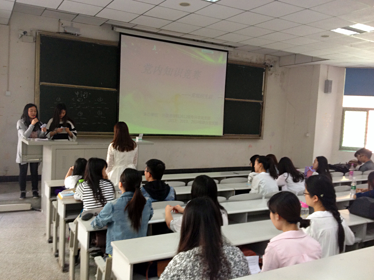 此次竞赛以4-5人为小组进行现场党内知识问答的形式开展,分为必答题、限时判断题和抢答题三个环节。前两个环节中,参赛小组成员依次轮流作答,比赛过程中,党员选手们积极思考,认真作答,各组成绩不相上下。随着比赛的难度升级,进入抢答题环节,同学们争分夺秒,你追我赶,积极抢答,现场氛围异常热烈。经过三个环节的比拼,第5小组以最全场最高分获得“第一名”,2012级学生支部冯倩同学获得“个人优秀奖”。知识问答结束,同学们还观看了“李克强主席答中外记者问”的视频短片,共同学习了党和国家的最新政策方针。