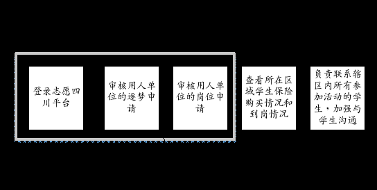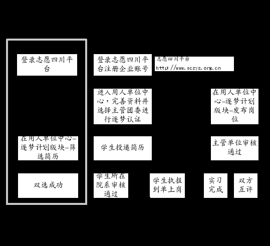 (一)启动实施阶段(2017年5月至6月)。用人单位于即日起登录“志愿四川”网站(http://www.sczyz.org.cn/),单位注册后完成岗位信息的集中录入,并提交审核。各区(市)县团委登录“志愿四川”网站(http://www.sczyz.org.cn/),完成募集岗位集中审核工作。岗位集中募集、录入、审核工作完成后,进行岗位双选,完成岗位匹配;6月底,完成学生审核报到、签订实习协议,落实大学生意外伤害保险;7月大学生集中上岗实习,活动转入常态化持续进行至年底。(详细操作流程见“逐梦计划”操作流程图。)