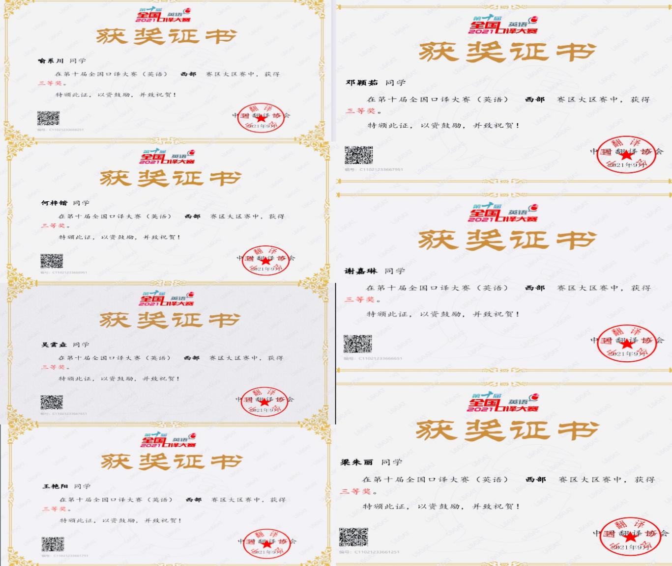 2021年9月30日,第十届全国口译大赛(英语)西部大区赛圆满落幕,新葡京官网新葡的京集团88142017级翻译专业何梓锴、谢嘉琳,2018级英语专业王艳阳、邓颖茹,2018级翻译专业梁朱丽,2019级翻译专业喻系川、吴雲垚7位同学凭借过硬的专业水平出色地完成比赛并斩获大区赛三等奖,刷新了新葡京官网在全国口译大赛中的最佳成绩。