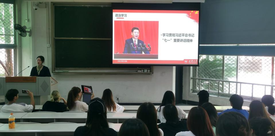 最后,彭陈丽老师指出,外院团委学生会要认真学习习近平总书记“七一”重要讲话精神,深刻领会习近平总书记和党中央的关心厚爱,准确领会在党的百年庆典上共青团员集体致献词这一议程的深远考量,进一步认识当代青少年所肩负的历史使命和共青团所承担的重大政治责任。要以学习宣传贯彻习近平总书记“七一”重要讲话精神为重点,持续加强青少年思想政治引领,让“请党放心,强国有我”成为广大共青团员的切实行动。