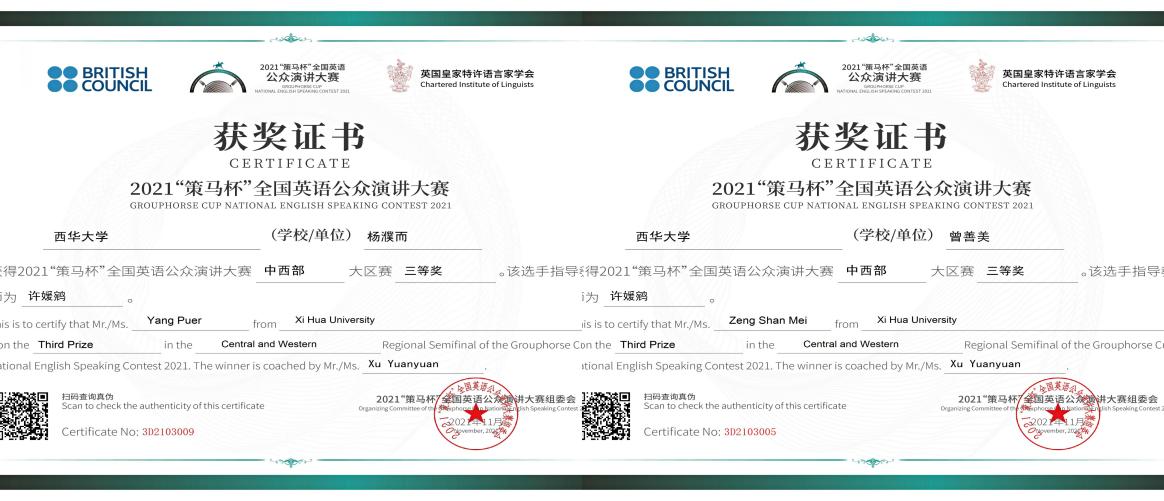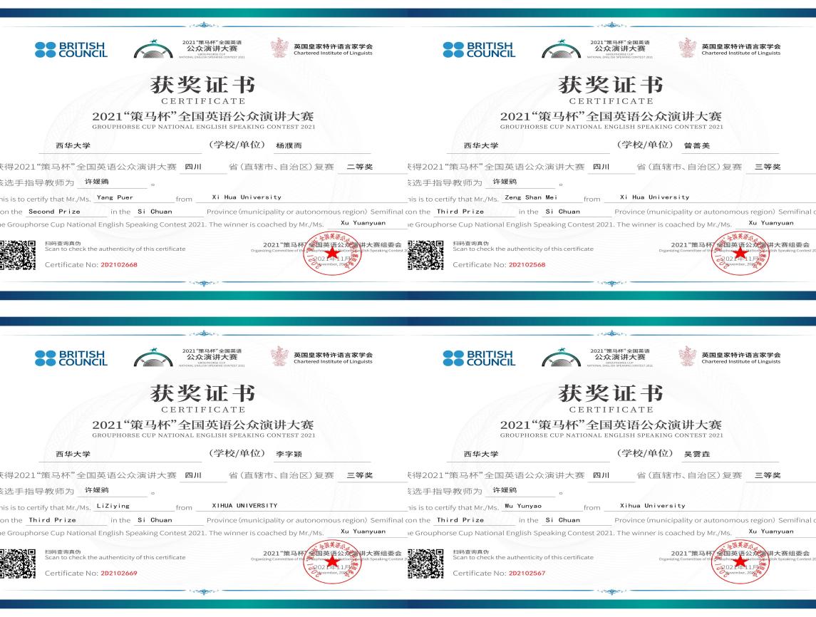 新葡京官网学子在本次大赛取得优异成绩,展现了西华学子的英语语言能力,彰显了新葡京官网近年来深化教学改革的长足进步与成效,巩固了以赛促教、以赛促学、以赛促改、以赛促建的治学理念。新葡京官网师生也将再接再厉,力争再创佳绩。