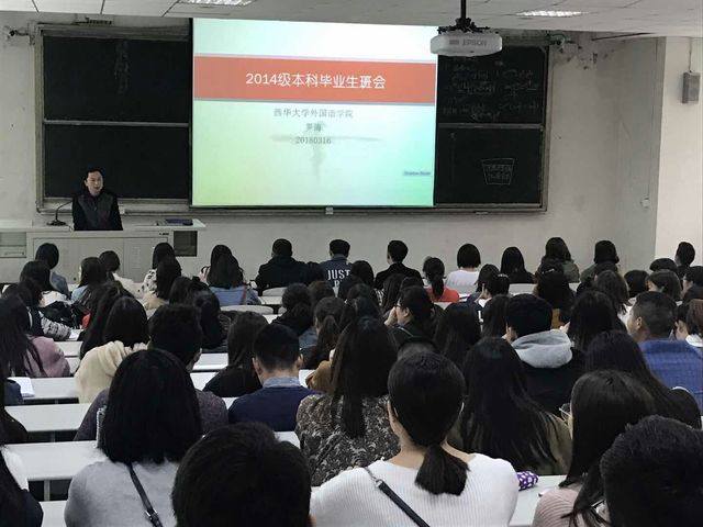 学院党委副书记罗海首先对2014级本科毕业生的就业情况进行简要通报,并围绕毕业论文及答辩、就业与择业、考研与出国、毕业生党团组织关系、人事档案、户口等相关毕业事宜进行讲述。罗海要求同学们积极与论文指导老师建立长期的联系,提前做好论文答辩准备;面对日益严峻的就业形势,要清楚地了解和认识当前的就业环境的同时,更要准确定位、明确择业目标,树立正确的就业观和择业观,对于还未就业的同学要正确地认识自己、不断总结经验,主动寻找就业机会,时时关注学校就业网站、微信和微博招聘信息,多途径、全方位争取就业;对于考研上线的同学,一定要争取读研,努力让自己的学历上台阶。罗海还叮嘱同学们在求职过程中一定要注意安全,学会保护自己、谨防就业陷阱,及时与学校老师保持联系。