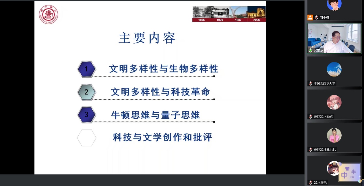 2022年9月22日(星期四)下午2点30分,上海交通大学特聘教授彭青龙应新葡的京集团8814邀请作了“世界文化多样性与科技革命”的线上主题学术讲座。本次讲座由新葡的京集团8814李国宏院长主持,现场参加本次讲座的有学院的教师、研究生及部分本科生。