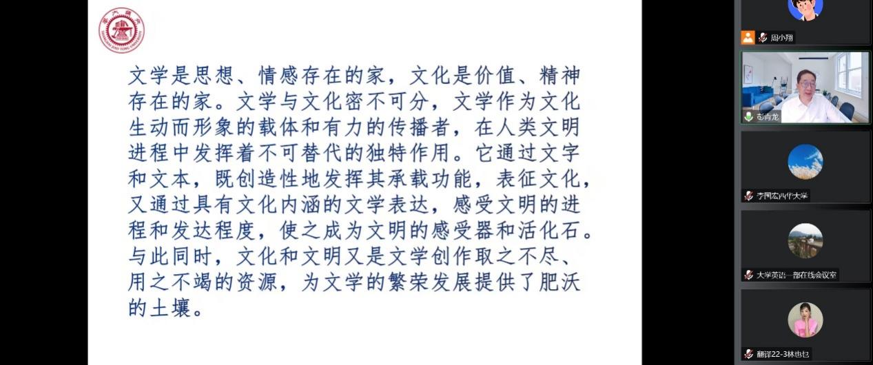 接下来,彭教授为大家讲解了自己关于文学的见解,他提到文学是思想,是情感的“家”,同时文学也是价值和精神的“家”。文化和文明更是文学有力的传播者和坚实的承载体。文学是让文化和文明“活起来”的宝贵之物,呼吁大家要更加认真地学习文学,感受它和文明和文化之间的密切关系。