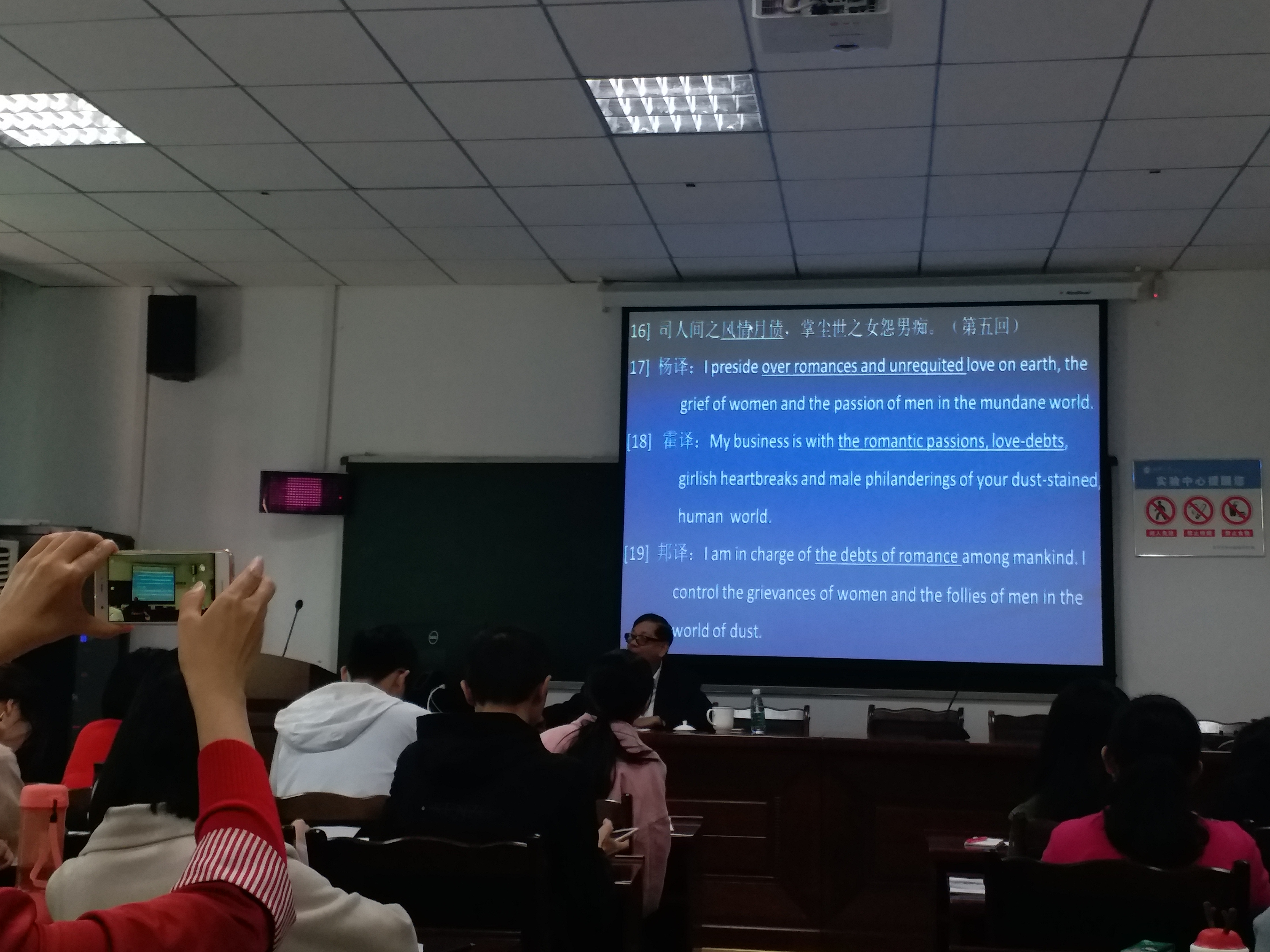 2018年11月2日上午,四川外国语大学王寅教授来到新葡的京集团8814,在4B-111教室作了题为“体认语言学视野下的汉语成语英译——以《红楼梦》300成语的三个译本为例”的讲座。