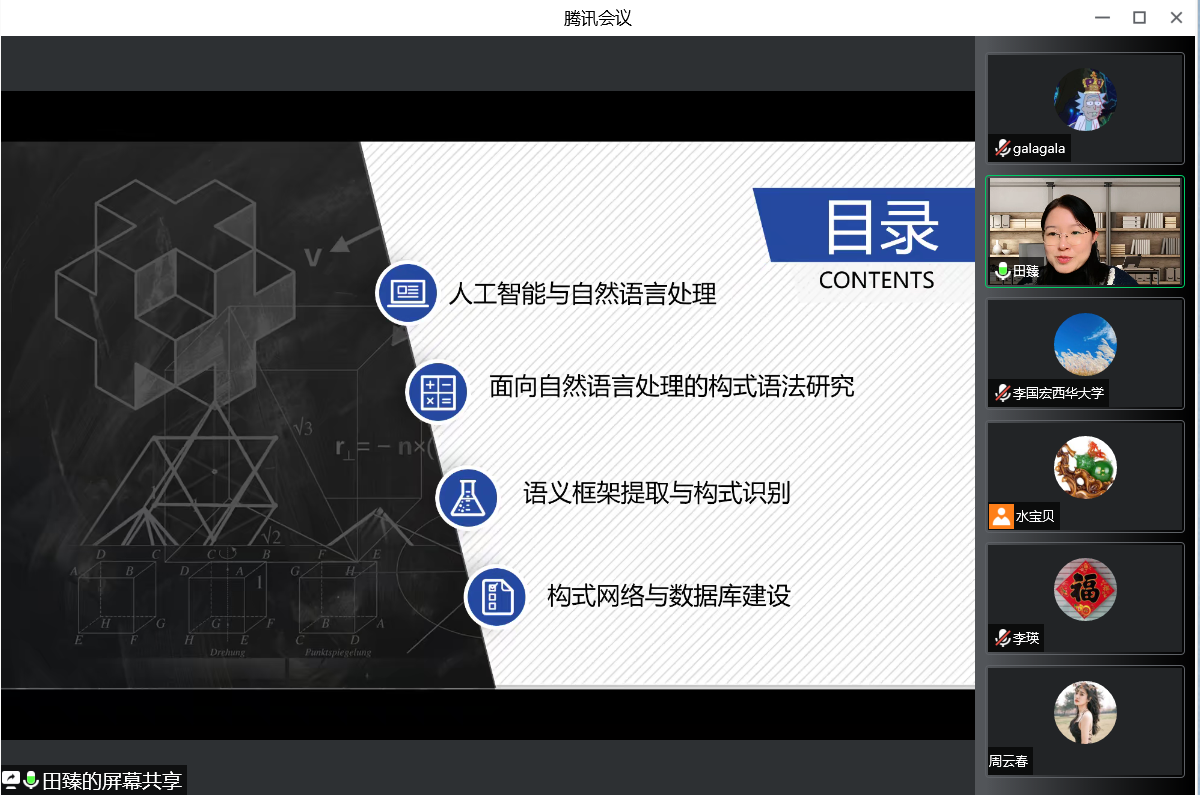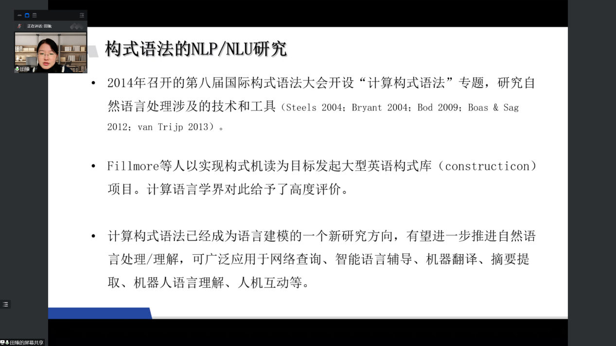 第二部分中,田教授介绍了“面向NLP的语言学习研究,构式语法的NLP/NLU研究,构式语法的NLP/NLU分析优势,构式语法研究热点”向师生们介绍了计算构式语法已经成为语言建模的一个新研究方向,有望进一步推进自然语言处理/理解,可广泛应用于网络查询、智能语言辅导、机器翻译、摘要提取、机器人语言理解、人机互动的大背景。