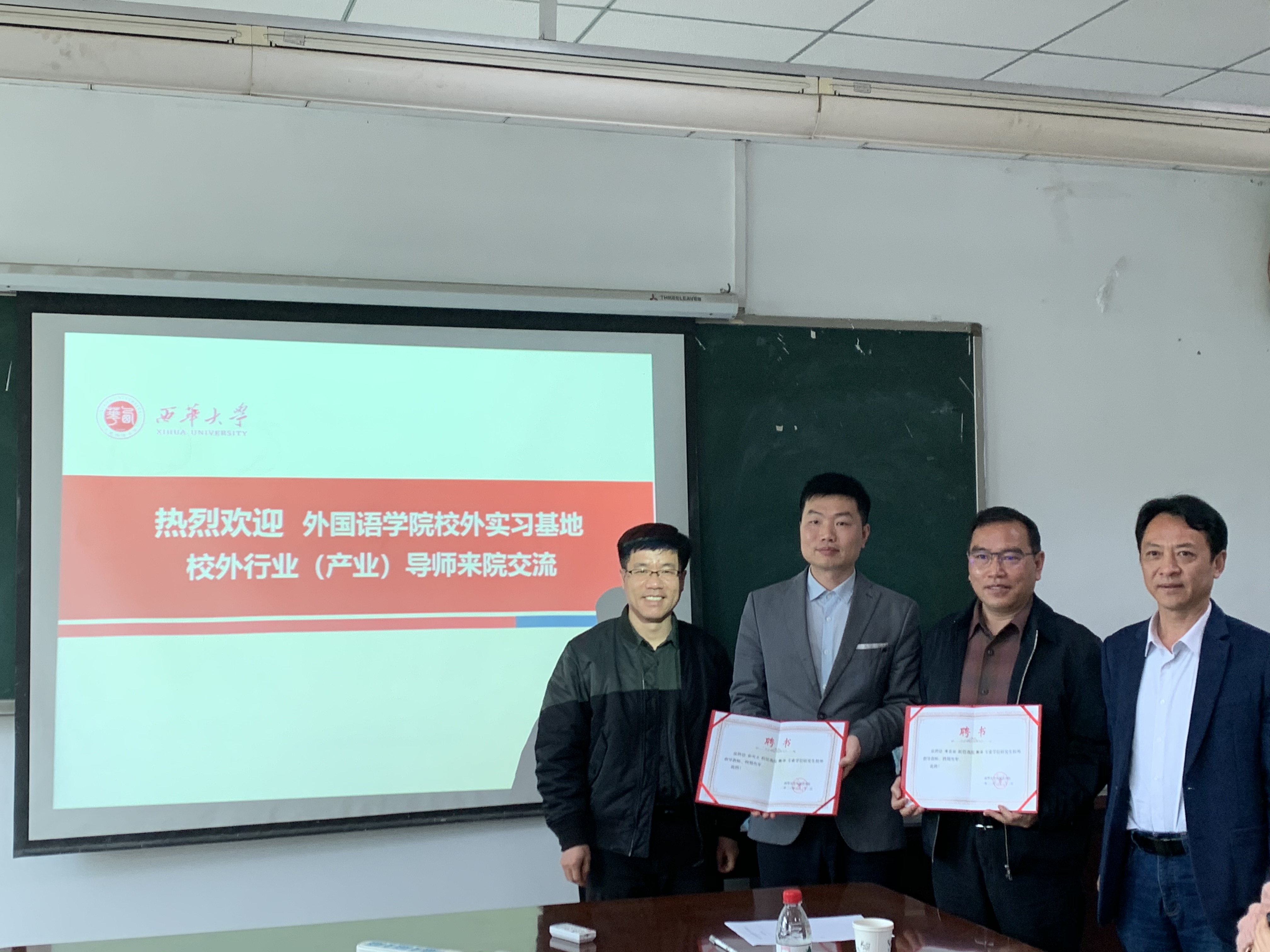 会上,成都思译翻译有限公司总经理黄昌佑老师、成都策马翻译有限公司彭刘力老师分别介绍了公司情况,以及行业(产业)导师的基本情况,对学院学生开展专业实践指导,提升职业胜任力提出了建议和意见。随后李国宏院长从学院领导和导师的角度对校外产业行业导师对开展合作、协同指导研究生提出了相应要求,设定目标、树立信心、拓宽视野、提升表达能力,要求学生真正的得到实践机会,学到真东西,希望实习基地能多给学生机会,把他们带入专业的领域,校、外导师通力合作大力培养翻译人才。学院为校外行业(产业)导师颁发了聘书。
