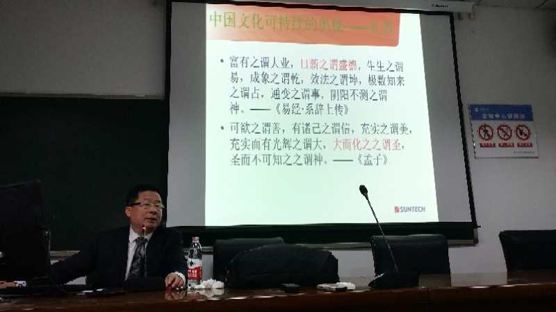 讲座主要内容围绕中国文化特质是心物一元,自他不二展开。其表现形式为尊道贵德,主张德本才末,先义后利,这些都源于中国文化天人合一的自然哲学观,即道法自然,一体两面。武波教授从《易经》角度出发阐述了中国文化“三位一体”的内涵,即道统(世界观)、和合(方法论)、礼教(可持续之保证)。通过“一观,二法,三例”向大家剖析国学修养在翻译人生中的重要性。