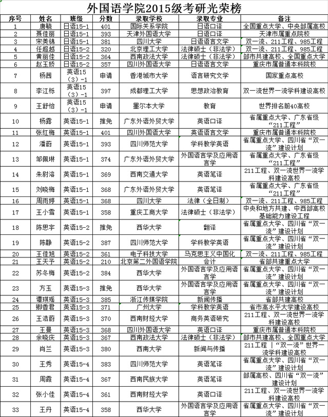 2019年考研总人数全国为290万,同比增长21%,创下改革开放40年来报考最高纪录。截止4月底,新葡京官网2015级本科生已经确认被国内外高校(拟)录取的人数为33人!录取院校含国内外知名学府、“双一流”建设高校、外语类国内知名高校等。